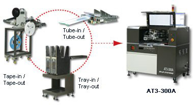 Il sistema può lavorare in diverse condizioni, utilizzando vassoi, stecche e nastri come dispositivi di uscita e d' ingresso in modo che i chip possano essere programmati, marchiati e confezionati in modo automatico.